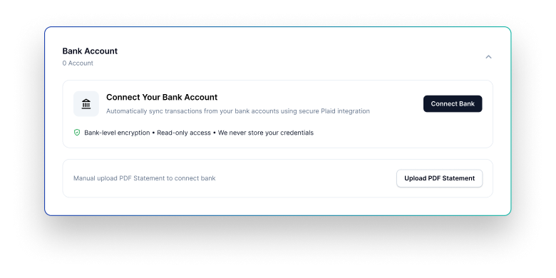 Link bank accounts via Plaid and upload receipts. AI automatically syncs and organizes everything.